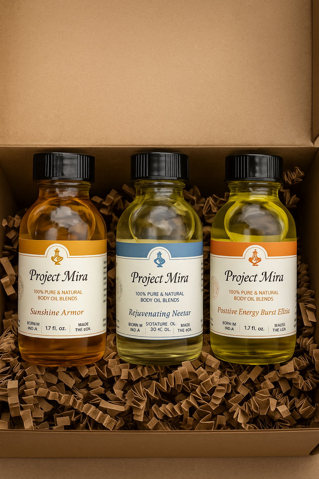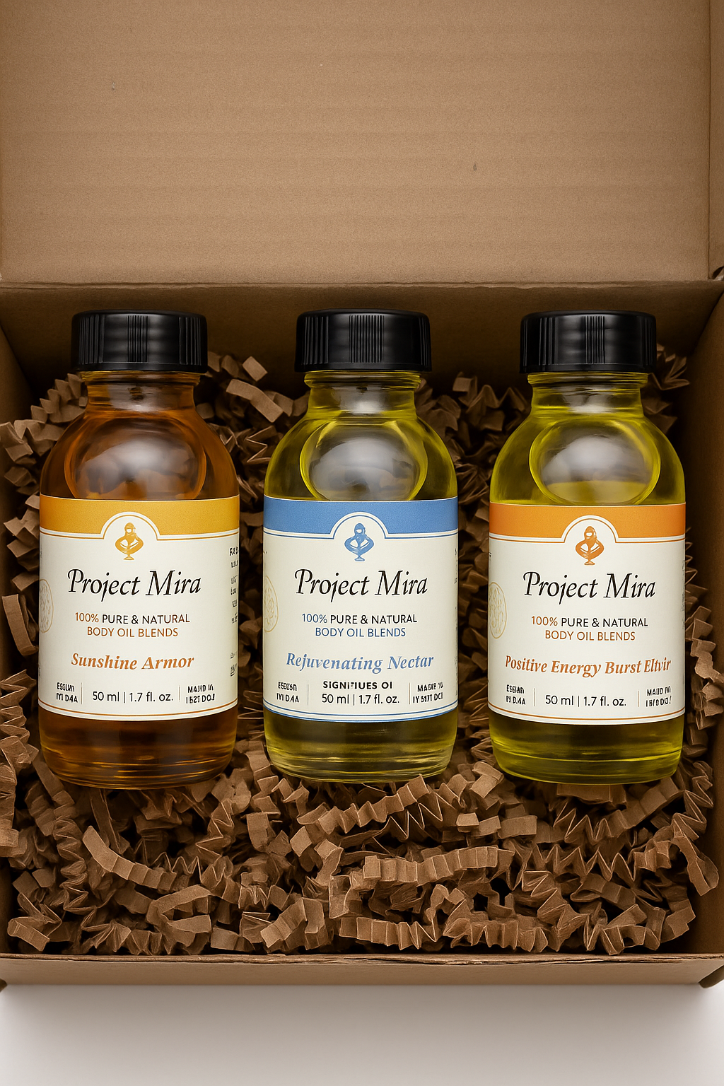 Vitality Trio is a Natural Body Oil Set that boosts your daily rituals. This natural body oil gift set includes Rejuvenating Nectar for hydration, Sunshine Armor for skin protection, and Positive Energy Burst for mood and energy. Perfect for morning routines, self-care, or thoughtful wellness gifts. Energize your day with the Vitality Trio—hydration, sun protection & citrus energy oils for strength, renewal, and positivity.